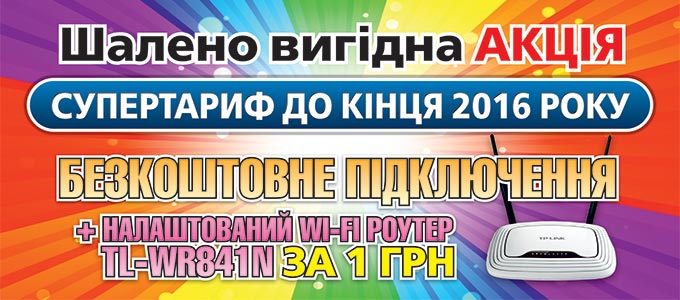 Новини: Супер-тариф на 2016 рік + роутер за 1 грн30.05.2016 | Переглядів: 8978Поспішай стати новим абонентом ТІМ-Інтернет та отримай в подарунок Супер-тариф на весь 2016 рік — швидкість до 100 Мбіт / сек лише за 70 грн / міс. Підключення безкоштовне. Також пропонуємо налаштований Wi-Fi роутер TP-Link TL-WR841N за 1 грн. Акція діє тільки для м. Прилуки до 1 серпня 2016 року! |