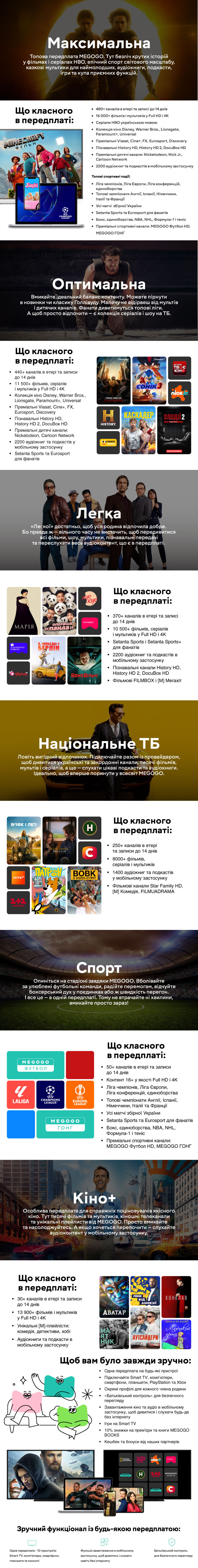 *** - Кількість каналів актуальна станом на 15.08.2025 і може змінюватися. Актуальний перелік каналів дивіться за посиланням: https://megogo.net/ua/tv